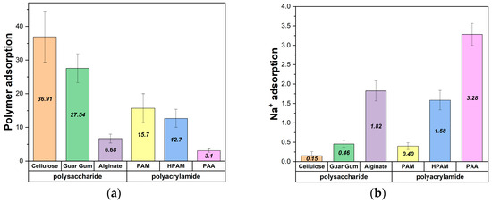 This study focused on brucite’s basal face (001) using the structure developed in [16], which consists of layered sheets with magnesium bonded to six hydroxide groups, forming an octahedral structure. At the same time, the oxygens have three bonds to different magnesium (Figure 1a). This structure was formed using a unit cell of (a, b, c) = (0.5540, 0.3205, 0.4840), (α, β, γ) = (90, 90, 90), from which a supercell of 20 × 32 × 2 was generated, yielding a surface area of 113.63 nm² and a thickness of 0.90 nm. The polymers studied in this work included six polymers: three from the polysaccharide family and three from the polyacrylamide family (Figure 1b). From the polysaccharide family, the studied polymers were cellulose, alginate, and guar gum. From the polyacrylamide family, the studied polymers were neutral PAM, HPAM, and PAA. For the polysaccharides, the three studied cases are described as follows: cellulose consists of D-glucose units linked by (1→4) bonds [29], alginate is a copolymer where β-D-mannuronate (M) and α-L-guluronate (G) units alternate and are linked by (1→4) bonds [30], and guar gum consists of linear α-D-galactose units linked by (1→4) bonds, with one of the units laterally connected to a β-D-mannose unit through a (1→6) bond, forming hanging groups [31]. The polyacrylamide family consists of neutral polyacrylamide, which consists only of acrylamide monomers; HPAM, consisting of 25% acrylate groups and 75% acrylamide groups arranged every three acrylamide units with one acrylate; and PAA, that consists solely of acrylate groups. The monomers used were 12 for polysaccharides and 48 for polyacrylamides, giving a similar linear length of 12 nm. The pH for investigating these systems was pH 11, which means that brucite is in its neutral state or isoelectric point. Cellulose, guar gum, and PAM maintain neutrality, while alginate, HPAM, and PAA have fully charged negative groups due to their pKa values ranging from 4 to 5. The ions present, such as sodium and chlorine, are represented by ionic atomic units dissolved in the medium. Water molecules are represented as one oxygen atom and two hydrogen atoms.