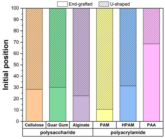 Figure 6 shows the proportion of polymer-surface interactions as a function of the initial polymer configuration (end-grafted and u-shaped). The results indicate that the end-grafted configuration accounts for 28% of cellulose, 30% in guar gum, 23% in alginate, 10% in PAM, 30% in HPAM, and 70% in PAA. These findings suggest that for polysaccharides, the proportion of end-grafted interactions is quite similar between guar gum and cellulose, while it is notably lower for alginate. In contrast, the polyacrylamide family increasingly prefers the end-grafted configuration as the polymer’s charge increases. This trend is due to the general repulsion between the charged polymers and the brucite surface, which is locally anionic. The pronounced preference for the end-grafted position in PAA can be attributed to its higher charge density than alginate, further emphasizing the electrostatic repulsion with the brucite surface.