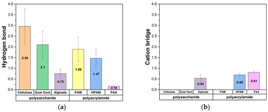 (a) Average number of hydrogen bonds formed between polymers and the brucite surface. (b) Average number of cationic bridges.