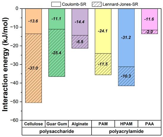 In contrast, for polyacrylamides (PAM, HPAM, and PAA), Coulombic interactions dominate, reflecting the role of their charged or partially charged acrylamide and acrylate groups. Unlike polysaccharides, the main chain of polyacrylamides does not interact directly with the surface. Instead, their adsorption relies on specific interactions, such as hydrogen bonds or cationic bridges, driven by the charges on their functional groups. The stronger Coulomb contributions observed in charged polymers like HPAM and PAA further emphasize this dependence on electrostatic forces.