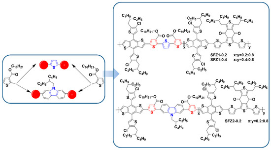 Two unfused structures (3T and 2TKZ) are designed and synthesized based on thiophene and 9-(2-ethylhexyl)-9H-carbazole, which linked two decyl thiophene-3-carboxylate (T), respectively [17,18]. Terpolymers SFZn-x (Figure 1) are obtained by randomly and partly replacing BDD units with 3T or 2TKZ in the strong-aggregation BDT-BDD backbones. The n in SFZn-x corresponds to the type of second acceptor units, and x is for the content. For example, SFZ1-0.4 is synthesized by 1 equivalent BDT, 0.6 equivalent BDD, and 0.4 equivalent 3T monomers, while SFZ2-0.2 is obtained by the ratio of 1, 0.8, and 0.2 in BDT, BDD, 2TKZ. The synthesis of the monomers is shown in the Supplementary Information.