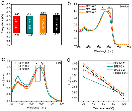 (a) Energy levels from LSV curves, absorption in (b) solution and (c) film, and (d) dependence of temperature-I0-0/I0-1 from UV-vis absorption at different temperatures.