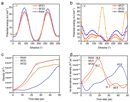 The conformations of polymers were evaluated with molecular dynamics (MD) simulations by the Large-Scale Atomic/Molecular Massively Parallel Simulator (LAMMPS) program [30,31] for the model oligomers 4-D-A-unit (D-A-D-A-D-A-D-A) as RAW, SFZ1, and SFZ2 (Figure S3c). The simulation box contained 30 oligomers distributed randomly in 150 × 150 × 150 Å3. The atom file was generated with Auxiliary Tools of Force Field (AuToFF) [32] and the Packing Optimization for Molecular Dynamics Simulations (Packmol) program [33] by All-atom force fields OPLS-AA/L [34,35]. Each model oligomer was simulated at 300 K and 0 atm in the NPT. Figure 4c shows the density curves of the simulation during equilibration at 50 ps. All densities of the model oligomers continued to grow. After rapid growth, the densities of SFZ1 and SFZ2 slowly increased with fluctuations, indicating that the system tends to equilibrate; however, at the end of the simulation, RAW still did not exhibit a clear equilibrium trend. Figure 4c corresponds to the rate of density change. In 50 ps, all oligomers experienced a maximum, with SFZ1 being the first to reach it, followed by SFZ2, and the RAW reached its maximum only at the end. In addition, SFZ1 began to enter relative equilibrium at ~32 ps, SFZ2 was not in relative equilibrium until ~39 ps, and RAW did not exhibit a similar state until the end. The equilibrium of the density profile corresponded to the equilibrium system. The system reached equilibrium from nonequilibrium in the shortest time for SFZ1, indicating that its conformational adjustment was the easiest. This result is in agreement with the previous one. In addition, it also implies that both flexible (3T) and rigid (2TKZ) structures can facilitate the conformational adjustment of polymers.