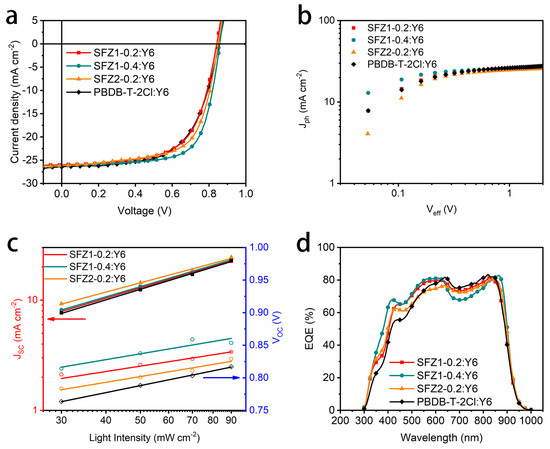 (a) J-V curves, (b) Jph-Veff curves, (c) light intensity dependence of JSC and VOC, (d) EQE spectra of Y6-based OSCs.