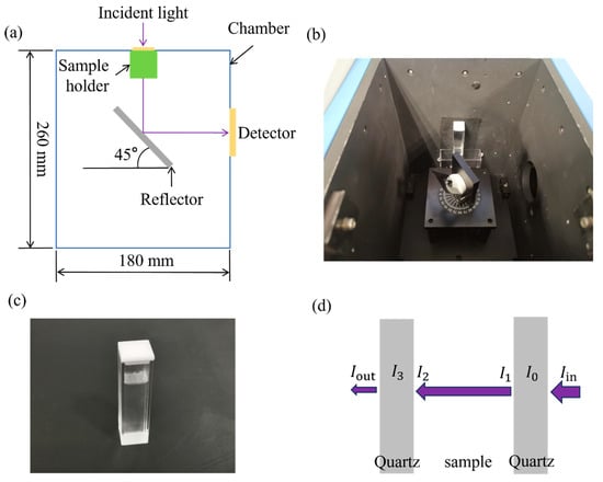 The intensity of light before and after passing through the quartz container can be quantified. However, when the sample was placed inside a quartz container, as depicted in Figure 1c, reflection occurred when light was transmitted from the air to the interior of the quartz material. As illustrated in Figure 1d, the path of the incident light was directed through the quartz container. To evaluate the transmittance of the specimen, it is necessary to measure the intensity of light passing through the sample inside the quartz container before and after. The detector was unable to record the incident light after passing through the specimen, as light was reflected when traversing the boundary between two materials with different refractive indices.