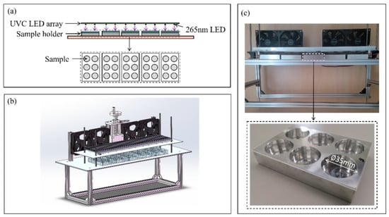 A specific piece of material aging equipment was designed for the UVC aging test. The configuration of this equipment is depicted in Figure 2a,b. Given that the LED package has an approximate divergence angle of 70 degrees, the specimens were placed at a distance of 10 mm from the LED chips to ensure uniform illumination of the entire surface of the silicone oil samples. To safeguard samples from contamination, a 1 mm thick quartz plate was placed over the sample holder. The completed experimental setup for the material aging test is illustrated in Figure 2c.