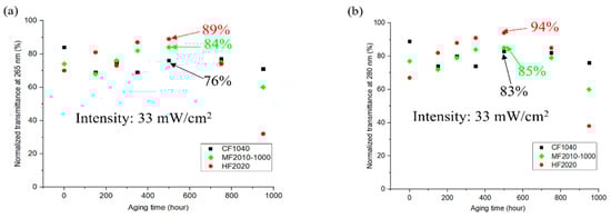 Transmittance at (a) 265 nm and (b) 280 nm with respect to aging time.