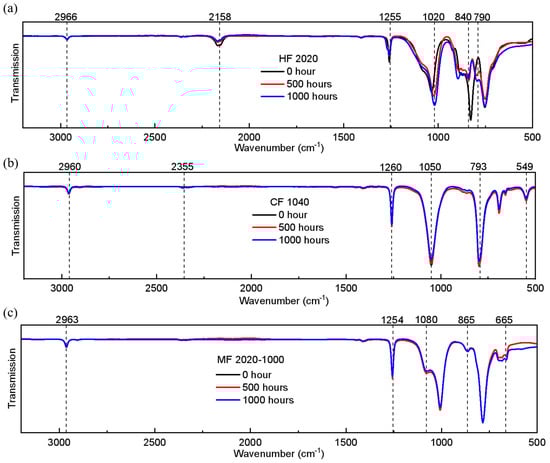 HF2020 self-cured after 250 h of 265 nm irradiation, and the material state changed from liquid to solid, while CF1040 remained in the liquid state. The samples aged 0 h, 500 h, and 1000 h were tested by FTIR, and the results of the chemical group changes were characterized in Figure 4.