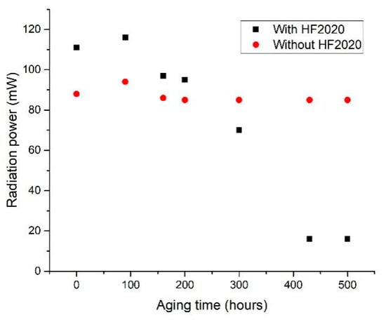 Device aging test for the UVC LED chip with and without HF2020 encapsulation.