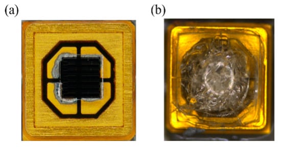 The morphology of UVC LED (a) before the aging test, and (b) after 500 h of aging time.