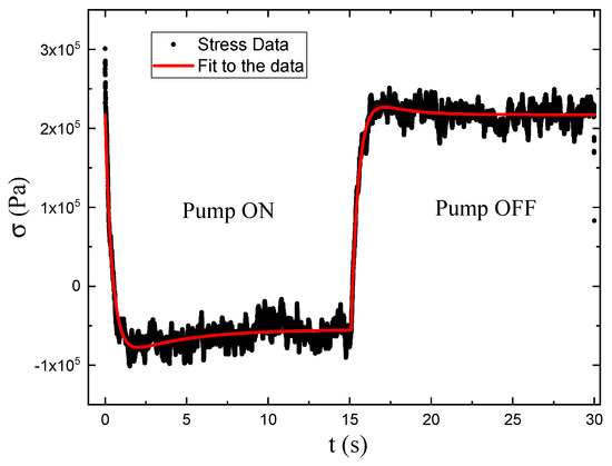 As shown in Figure 2, the photomechanical stress response as a function of time for fixed pump intensity follows a bi-exponential function of the form given by Equations (2) and (3). The data are fit to the model with a time offset of to determine the time constants and amplitudes.
