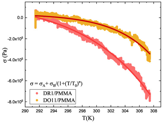 Measured temperature-dependent stress at constant sample length and with no light applied of DR1 and DO11 thin films (points) and a fit of the data (curves) to Equation (4).