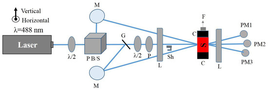 Figure 4 shows a schematic diagram of our experiment, which simultaneously measures the light-induced stress and monitors the transmittance of two orthogonal probe beams to determine the evolution of the population upon irradiation. The = 488 nm wavelength light from an argon laser passes through a half-wave plate and a polarizing beam splitter (PBS), then illuminates the sample. This beam acts as the pump, which induces a photomechanical response. The polarizer (P) is set to select the polarization of the pump light and the preceding half-wave plate is rotated to adjust its intensity. In a typical experiment, a run consists of the polarizer set to one angle, followed by a run where it is set perpendicular to the original orientation to obtain the polarization dependence of the response due to the pump along the two principal axes of the material.