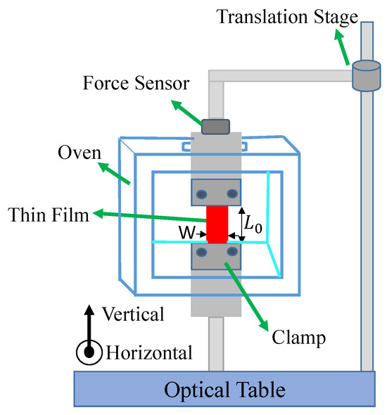 The same setup measures Young’s modulus by translating the upper clamp to stretch the sample. The setup records the strain and force to determine Young’s modulus. The in situ oven enables the temperature-dependent stress to be measured, which can be used to determine the effect of heating on the sample’s properties. Figure 5 shows the force measurement setup used to hold the sample and measure the Young’s modulus and the stress.