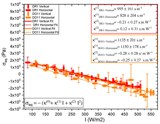 The data for each polarization are fitted to a quadratic polynomial which is in the form of Equation (1), and it shows that I is large compared to over the data range, so the stress response is linear within fractional deviations of 0.02 and 0.13 for DR1 and 0.05 and 0.12 for DO11 with horizontal and vertical polarizations of light, respectively, where the fractional deviation is given by at the highest measured intensity.