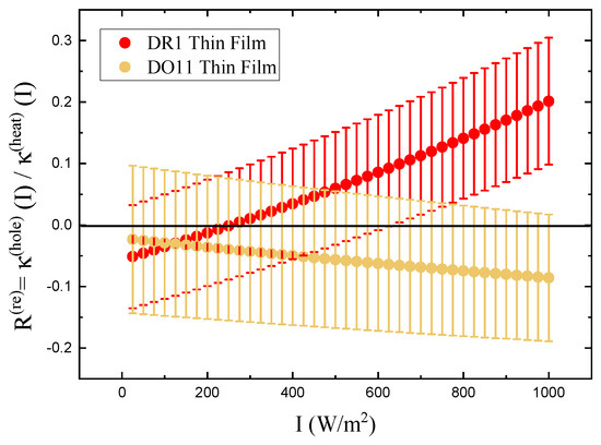 One parameter of interest is the long-time stress response , where and come from the fits to the data to Equations (2) and (3) at each intensity. These are plotted in Figure 6. The long-term stress response of DR1 and DO11 is the same within experimental uncertainties at each intensity. However, this does not mean that of DR1 is the same as of DO11 and that of DR1 is the same as of DO11, just that the sum is the same. As such, the heating contribution to the photomechanical response may be drastically different in the two materials even though their photomechanical response is the same.