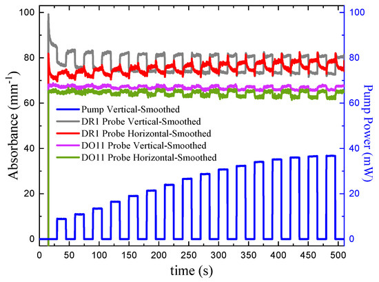 Comparisons of light-induced stress and absorbance in DR1- and DO11-doped PMMA thin films can be used to deduce the mechanisms of the photomechanical response in photoisomerizable samples. The entire area of the sample is illuminated by the pump in a 15 s on and 15 s off cycle. After multiple repetitions, the intensity is increased and the protocol repeated. Typically, the experiment cycles through fifteen different intensities.