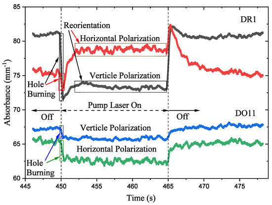 Time-dependent dichroism measurements probe the dopant dye’s orientational distribution function in response to a strong pump being turned on and off. In DR1-doped PMMA, these measurements show a fast evolution of dichroism due to hole burning and a slower but stronger signal due to molecular reorientation. These observations are consistent with expectations of a fast initial excitation of a cis isomer followed by the slower process of reorientational diffusion. DO11, which does not photoisomerize, shows no long-term molecular reorientation but does show a smaller degree of hole burning. The underlying mechanism is most likely due to the photo-tautomerization due to a proton hopping from the amine group to the carbonyl group, which is a known process responsible for self-healing [36,37,38].