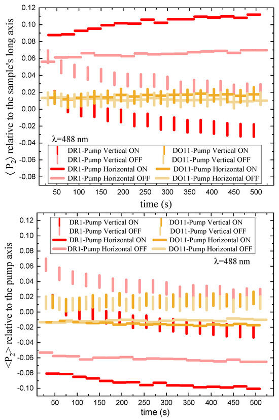 This observation is as expected in DO11, which has only one conformation and so it should be dominated by photothermal heating alone, a process that is polarization-independent. However, since DR1 is known to photoisomerize [1,4], which leads to angular hole burning [1,4,28,29,30], the data suggest that the light-induced change in the molecular orientational distribution function does not translate into a large enough photomechanical response to be detectable within experimental uncertainties relative to the dominating photothermal heating mechanism. In addition, the magnitudes and of DO11 and DR1 agree with each other within experimental uncertainty, strengthening the conclusion that the mechanism of the response is the same in both materials. However, as seen in Figure 6, the horizontal polarization data for DR1 dye is systematically lower than the vertical polarization data and at the edge of experimental uncertainty, allowing for a small contribution from a mechanism that is not found in DO11. This could originate from photoisomerization.