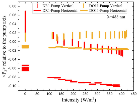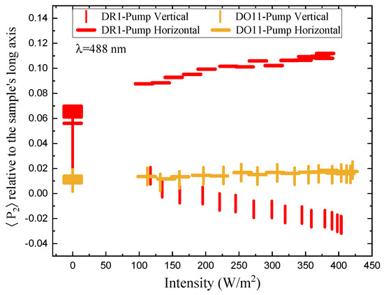 Intensity-dependent dichroism measurements are used to determine the axial order parameter , which is a measure of the axial alignment of the dopant molecules. In DR1, the pristine material after fabrication is slightly anisotropic. The observed dichroism after the material reaches equilibrium under optical pumping increases with increased intensity, as we would expect of molecular reorientation where the reorientational diffusion rate increases with pump intensity. However, the 15 s recovery time between measurements is not enough time to allow for the reorientational alignment to relax. At the higher intensities, the residual axial alignment with the pump off in the time interval that precedes the pump can be as high as 40% of the value induced when the pump is turned on. This residual alignment builds over the course of the experiment. As such, the fraction of the pump light absorbed decreases since fewer molecules have a substantial projection of their axis along the pump polarization. This will lead to a smaller photomechanical response than for a pristine sample. In contrast, DO11 is isotropic from the start and shows very few intensity-dependent effects.