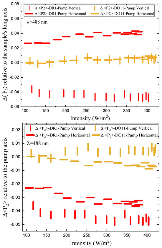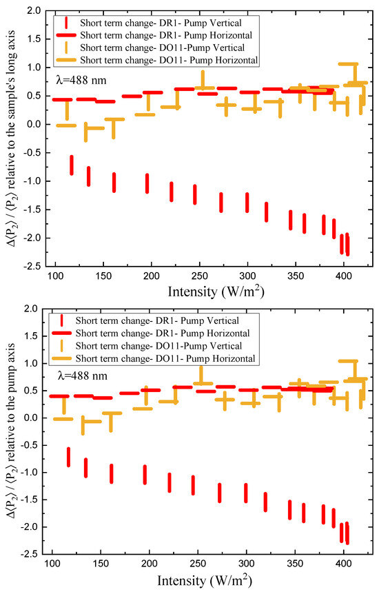 The vertical and horizontal lines (representing the pump polarization relative to the vertical) show the predicted heating contribution to the photomechanical response for DO11 and DR1 thin films using the theory given by Equation (9). The time constants at each intensity used in the model are the measured ones in Figure A1 in Appendix A. The width of the bands show one standard deviation band of the magnitude of the fast component of the experimentally determined intensity dependent photomechanical constant, which is determined from a quadratic fit of the stress data shown in the top graph in Figure 16.