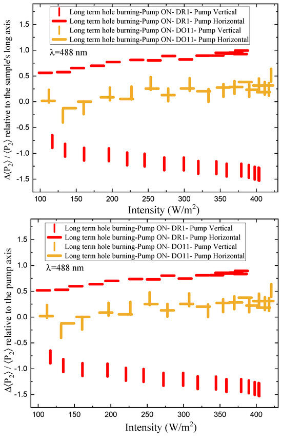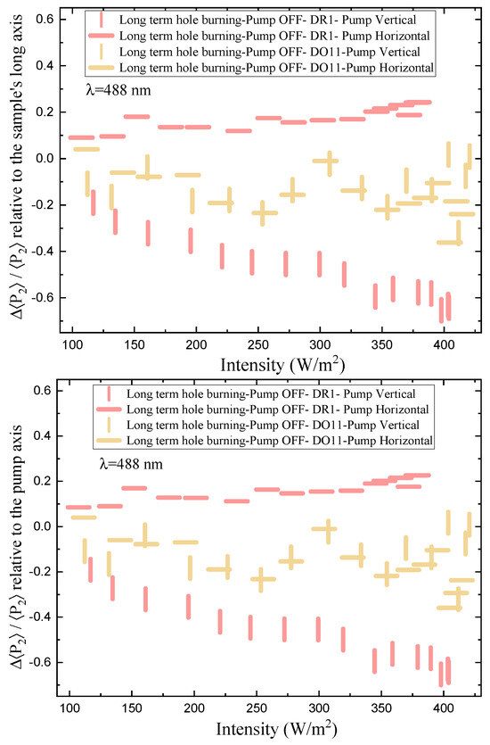 The vertical and horizontal lines (representing the pump polarization relative to the vertical) show the predicted heating contribution to the photomechanical response for DO11 and DR1 thin films using for the time constant as a function of intensity using the semi-empirical theory given by Equation (12). The one-standard-deviation bands show the experimentally determined intensity-dependent photomechanical constant using a fit of the stress data to a quadratic function in the intensity, as shown in the top graph in Figure 16.