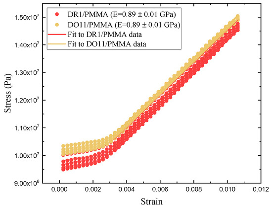 The parameters and are determined for DR1- and DO11-doped PMMA for both vertical and horizontal pump intensities from fits to the data to Equation (37) as shown in the top portion of Figure 16. The same is performed for the long-term stress response for the process associated with time constant by fitting the data in the bottom portion of Figure 16 to the power series expansion given by Equation (38). In this case, the data are relatively flat, so the fit includes only the linear term.
