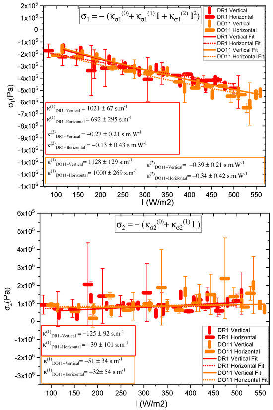 To summarize, the data given by Figure 16 are used to obtain the photomechanical coefficients for each process, which are substituted in Equations (37) and (38) to obtain the long-term stress . These fits are also used to determine the intensity-dependent photomechanical response for each process.