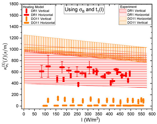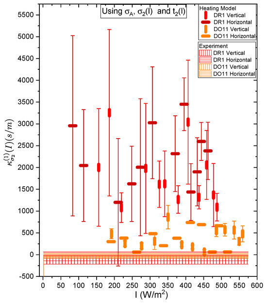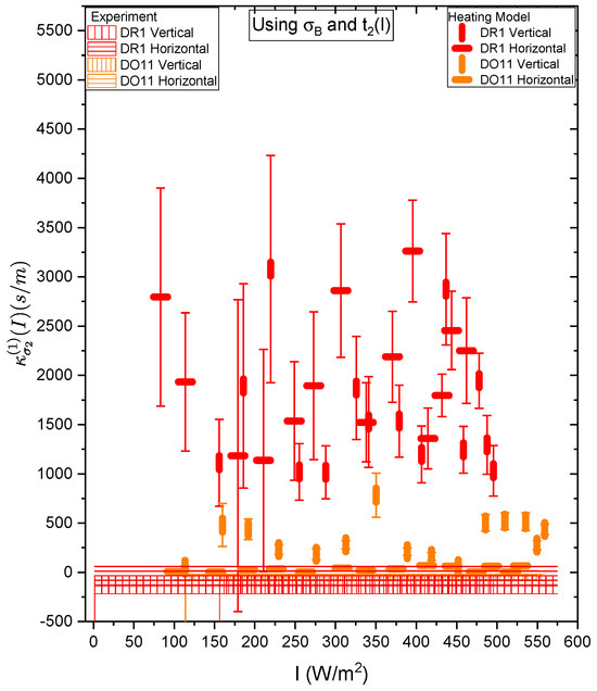 Figure 17 and Figure 18 show a summary of the theoretical and experimental intensity-dependent photomechanical constant for the faster process with response time . The bands are derived from the experimentally determined amplitudes of the fast process and their widths represent the one standard deviation uncertainty band. The vertical and horizonal data markers represent the photothermal heating model’s prediction for the intensity-dependent photomechanical response for the two orthogonal pump polarization directions. Their values are determined using the heating theory given by Equation (9), plotted in Figure 17, and Equation (12), plotted in Figure 18. The scatter in the plots originate from the scatter in the measured time constants that are input parameters to the theory. The semi-empirical theory using Equation (12) has an additional contribution to the uncertainty from and , which leads to larger error bars. Similarly, the error bands of the data are coded with vertical and horizontal hash marks to represent the polarization direction. Figure 19 and Figure 20 show the slower process with the time constant data and theory using and for the analysis.