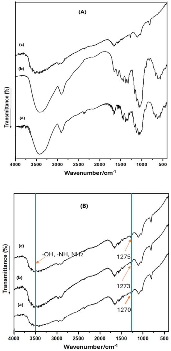 (A) FT-IR spectra of (a) Pure-Cell, (b) Cell-Cl, and (c) Cell-Jef148. (B). FT-IR spectra of Cell-Jef48 after adsorption of the metal ions, (a) Cu(II), (b) Ni(II), and (c) Pb(II).
