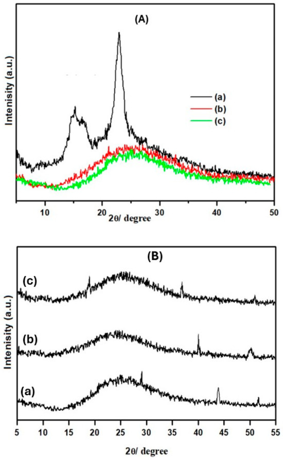 (A) X-ray diffraction of (a) Pure-Cell, (b) Cell-Cl, and (c) Cell-Jef148. (B) X-ray diffraction of Cell-Jef148 after the adsorption of metal ions (a) Cu(II), (b) Ni(II), and (c) Pb(II).