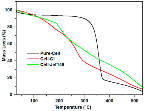 In Figure 5, thermogravimetric analyses of Pure-Cell, Cell-Cl, and Cell-Jef148 were displayed. According to thermogravimetric curves, Cell-Cl and its modification, jeffamine EDR148, Cell-Jef148, showed less heat stability than pure cellulose. Cellulose remains stable up to 250 °C and begins to decompose between 250 and 380 °C with a 92% mass loss due to the pyrolytic decomposition of the carbon backbone. After the introduction of Cl atom to cellulose backbone, the degradation rate decreased in Cell-Cl to be in the range of 150–280 °C, compared to the degradation rate of pure cellulose with 80% mass lass. Additionally, Cell-Cl showed two degradation stages. The first stage is in the range of 150–250 °C, due to the C-Cl bond cleavage and condensation of OH groups on C-2 and C-3 of cellulose. The other decomposition stage, in the range of 250–350 °C, corresponds to the degradation of the cellulosic chain [36,40,41,42].
