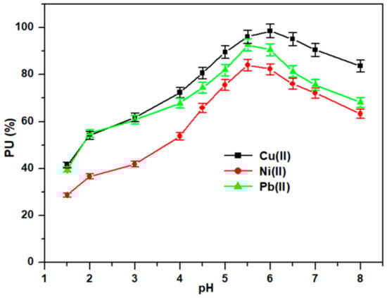 The pH medium affected the adsorption efficiency of Cell-Jef148 towards the heavy metal ions as shown in Figure 6. The effect of pH on the Cell-Jef148’s capacity to adsorb Cu(II), Ni(II), and Pb(II) ions of 500 mg/L metal ion concentration from an aqueous solution was investigated in the pH range of 1.5–8.0 at preliminary test conditions of temperature 25 °C, time of 4 h, 50 mL volume of adsorption medium, and adsorbent of 50 mg (Figure 6). The pH of the medium was adjusted before the addition of Cell-Jef48 adsorbent using 0.01 M hydrochloric acid. The maximum adsorption amounts of metal ion onto Cell-Jef148 were detected at pH 5.5 for Ni(II) and Pb(II) and at pH 6.0 for Cu(II). The adsorption capacities exhibited low levels at reduced pH values while demonstrating higher levels at increased pH values. According to the results, adsorption capabilities were high at higher pH levels and poor at lower pH values. Since the amine function is strongly linked to hydronium ions (H3O+) at lower pHs, the approach of metal cations is restricted due to the repulsion force, and as a result, the metal ions in solution cannot be bound. The adsorption surface becomes deprotonated when the pH rises, which increases the possibility of electrostatic attraction from amine groups providing electron pairs [46,47]. As a result, the complex reaction that these functional groups participate in during the metal ion absorption process causes the amount of adsorbed to rise. Moreover, the adsorption effectiveness began to decrease at increasing pH levels. The reduction in adsorption efficiency could be caused by the production of metal hydroxides and oxides at pH values greater than 6.0. Consequently, the optimum pH 5.5 value was applied to each of the following tests.