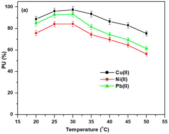 The adsorption efficiency of Cell-Jef148 towards the metal ions is significantly affected by the adsorption reaction temperature at adsorption parameters of 50 mg of the adsorbent, 500 mg/L metal ion concentration, 50 mL volume of the adsorption solution, time of 4 h, and pH 5.5. Figure 7a shows the adsorption capacities of Cell-Jef148 for Cu(II), Ni(II), and Pb(II) metal ions during the temperature range of 20–50 °C. It was observed that after 25–30 °C, on the surface of the modified cellulose sample, the metal ions’ adsorption decreased, suggesting that their diffusion rate was slower and their desorption rate was faster than their adsorption rate. For these heavy metal ions, lower temperatures—specifically, 25 °C—are ideal for generating the best adsorption efficiencies due to the exothermic behavior of the adsorption procedure.