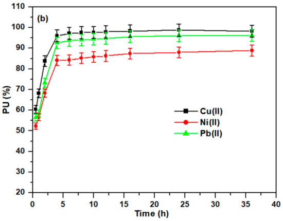 As illustrated in Figure 7b, the removal of Cu(II), Ni(II), and Pb(II) metal ions by Cell-Jef148 at various durations was investigated under adsorption reaction conditions of 50 mg of the adsorbent, 500 mg/L metal ion concentration, 50 mL volume of the adsorption solution, temperature of 25 °C, and pH 5.5. The removal efficiency of the heavy metal ions increased until 4 h of adsorption time. At 4 h, the maximum removal efficiency values were 96.06%, 84.2%, and 92.64% for Cu(II), Ni(II), and Pb(II), respectively. The adsorption behavior changed quite quickly in the beginning and then gradually attained equilibrium adsorption in 4 h. Since the adsorption equilibrium was reached in 4 h, increasing the adsorption duration after 4 h has no effect on the removal efficiency, which slightly increases with no significant effect or remains unchanged. The huge number of empty active sites on the adsorbent was occupied quickly by metal ions within 4 h; hence the removal efficiency was not significantly increased after that time.