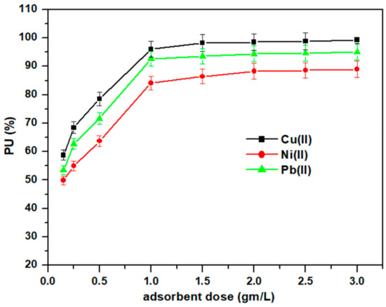 The amount of adsorbent is considered one of the most effective factors for the adsorption efficiency towards the heavy metal ions at adsorption conditions of 500 mg/L metal ion concentration, 50 mL volume of adsorption solution, temperature of 25 °C, time of 4 h, and pH 5.5. Figure 8 shows the effect of Cell-Jef148 dosages with a range of 0.025–0.125 gm in 50 mL of experimental solution as 0.15–2.5 gm/L adsorbent. As observed, the amount uptake of Cu(II), Ni(II), and Pb(II) increased with an increase in Cell-Jef148 amount up to 1 gm adsorbent dose due to increasing the quantity of the active binding sites in the solution. The equilibrium adsorbent dose was 0.05 gm (1 gm/L) for metal ions Ni(II) and Pb(II). The percent uptake was 84.1% and 92.64%, respectively, and also the equilibrium adsorbent dose for Cu(II) was 0.05 gm (1 gm/L) with a percent uptake of 96.06%. The rare increase or constant value of the percent uptake after the equilibrium adsorbent dose can be a result of the active adsorptive sites on Cell-Jef148 not being fully occupied with the metal ions. Accordingly, the optimum Cell-Jef148 dose was around 0.05 gm (1 gm/L), which was tested in the remaining factors examined.