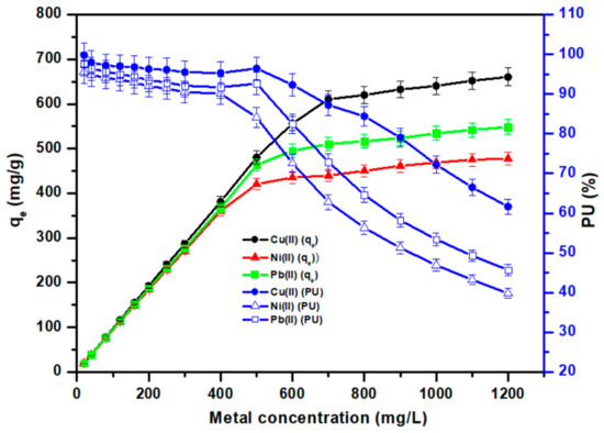 Figure 9 represents the adsorption capacity and percent uptake measured using Cell-Jef148, with metal ion concentrations of 20–1200 mg/L while maintaining constant the adsorbent’s dosage, duration, pH, and temperature as mentioned above. As shown in Figure 9, the results show that Cell-Jef48′s adsorption capacity increased significantly with higher initial metal ion concentrations, revealing a linear increase in manner at lower concentrations and an equilibrium at higher concentrations. With an increase in metal ion concentration up to 500 mg/L for Ni(II) and Pb(II) and 700 mg/L for Cu(II), Cell-Jef148 was able to absorb metal ions. The adsorbent’s active sites were satisfactory for holding the metal ions at low concentrations. The adsorption efficiency of Cell-Jef148 drops as the concentration of heavy metal ions is increased above the optimal values where the adsorbent Cell-Jef148 has no capacity to absorb extra molecules. The adsorption capacity remains almost constant after the optimal initial concentration of metal ions, and percent uptake decreases with rising metal ion concentration. This suggests that Cell-Jef148’s active sites reduce, which prevents the adsorbent from picking up more amounts of metal ions. For Ni(II) and Pb(II), Cell-Jef148’s adsorption capabilities were 420.4 mg/g (Pu of 84.1%) and 463.2 mg/g (Pu of 92.64%), respectively, at the initial metal concentration of 500 mg/L. Additionally, at the initial metal ion concentration of 500 mg/L, Cell-Jef148 had adsorption capacity of 480.3 mg/g (Pu of 96.02%) for Cu(II) ions.