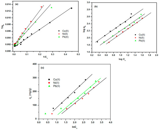 Langmuir (a), Freundlich (b), and Temkin (c) isothermal models for the adsorption of Cu(II), Ni(II), and Pb(II).