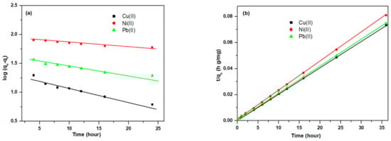 The adsorption kinetics of Cell-Jef148 towards CU(II), Ni(II), Pb(II) metal ions were examined using kinetics models of pseudo-first-order and pseudo-second-order. The different kinetic parameters listed for Cell-Jef14 m (1 gm/L) are shown in Table 2. Figure 11a,b represents the linear plot of pseudo-first-order and pseudo-second-order models using the following Equations (6) and (7), respectively [50,51].