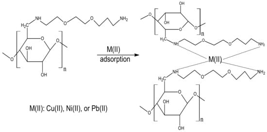 Heavy metal ion adsorption onto Cell-Jef14 adsorbent can arise by several types of interactions at the adsorbent interface, such as ion exchange, electrostatic interactions or coordination of the metal ion by the functional groups (–OH, –NH, and –NH2). In our study, FTIR (Figure 2B) provides a suitable explanation for the adsorption of Cu(II), Ni(II), and Pb(II) ions onto Cell-Jef148. As shown in FT-IR spectra (Figure 2B), the stretching vibrations of -OH and -NH2 bands slightly changed with decreasing intensity. Moreover, a slight shift of peak at C-N group was recorded after adsorption of the metal ions. These results suggested that there is a strong electrostatic interaction between Cell-Jef48 and the heavy metal ions [52,53], not coordination linkage, as shown in the following Figure 12.