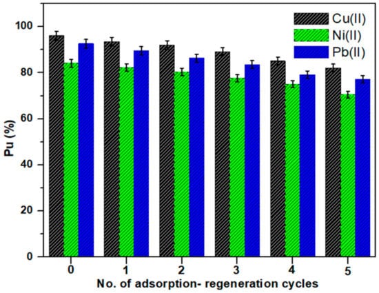 The evaluation of the desorption efficiency and reusability of Cell-Jef148 is necessary for industrial applications. The regeneration of Cell-Jef148 was studied for repeated adsorption of the heavy metal ions during six cycles using 0.2 M HNO3 as desorption reagent [26]. Figure 13 showed the adsorption ratio of regeneration adsorption by Cell-Jef148 for five cycles. As observed in Figure 13, the adsorption capacities of Cell-Jef148 for Cu(II), Ni(II), and Pb(II) were 82.1%, 70.5%, and 77.2% at the fifth cycle of regeneration, while the adsorption capacities at the first cycle of regeneration were 93.5%, 82.3%, and 89.6%, respectively. Accordingly, Cell-Jef148 lost from its initial adsorption capacity about 13.96%, 13.6%, and 15.44% for Cu(II), Ni(II), and Pb(II), respectively, after five cycles of desorption. All these results indicate that Cell-Jef148 has high stability with a high ability for regeneration and reuse as an adsorbent for removing heavy metal ions. Therefore, Cell-Jef148 could be employed as an affordable and eco-friendly adsorbent to eliminate the heavy metal ions from wastewater.