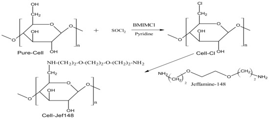Cellulose cotton and thionyl chloride (Wako Pure Chemical Industries, Osaka, Japan) were used without further purification. Jeffamine EDR148 (Jef148), ethyl acetate (Kishida Chemical Co., Osaka, Japan), N-methylimidazol, 1-chlorobutane, toluene (Kishida Chemical Co., Osaka, Japan), pyridine, sodium hydroxide, nickel chloride (NiCL2), copper chloride (CuCL2), and lead nitrate (PbNO3) were purchased from Wako Pure Chemical Industries, Ltd., Tokyo, Japan, and were used without further purification as well. To dissolve cellulose, an ionic solution of N,N-butylmethylimidazolium chloride (BMIMCl) was made as follows: 1-chlorobutane (1.38 mol) was combined with a stirred solution of 1-methylimidazole (1.25 mol) in toluene (125 mL, 1.356 mol) at 0 °C. After allowing the solution to reach room temperature, it was heated to 85 °C for 24 h under reflux and then frozen for another 24 h. To obtain a white crystalline solid, the semi-solid was decanted, cleaned with toluene, and then recrystallized from ethyl acetate. After drying, the resulting BMIMCl product had a yield of roughly 85%; proton (1H) NMR (400 MHz, chloroform-d) was used to characterize it.