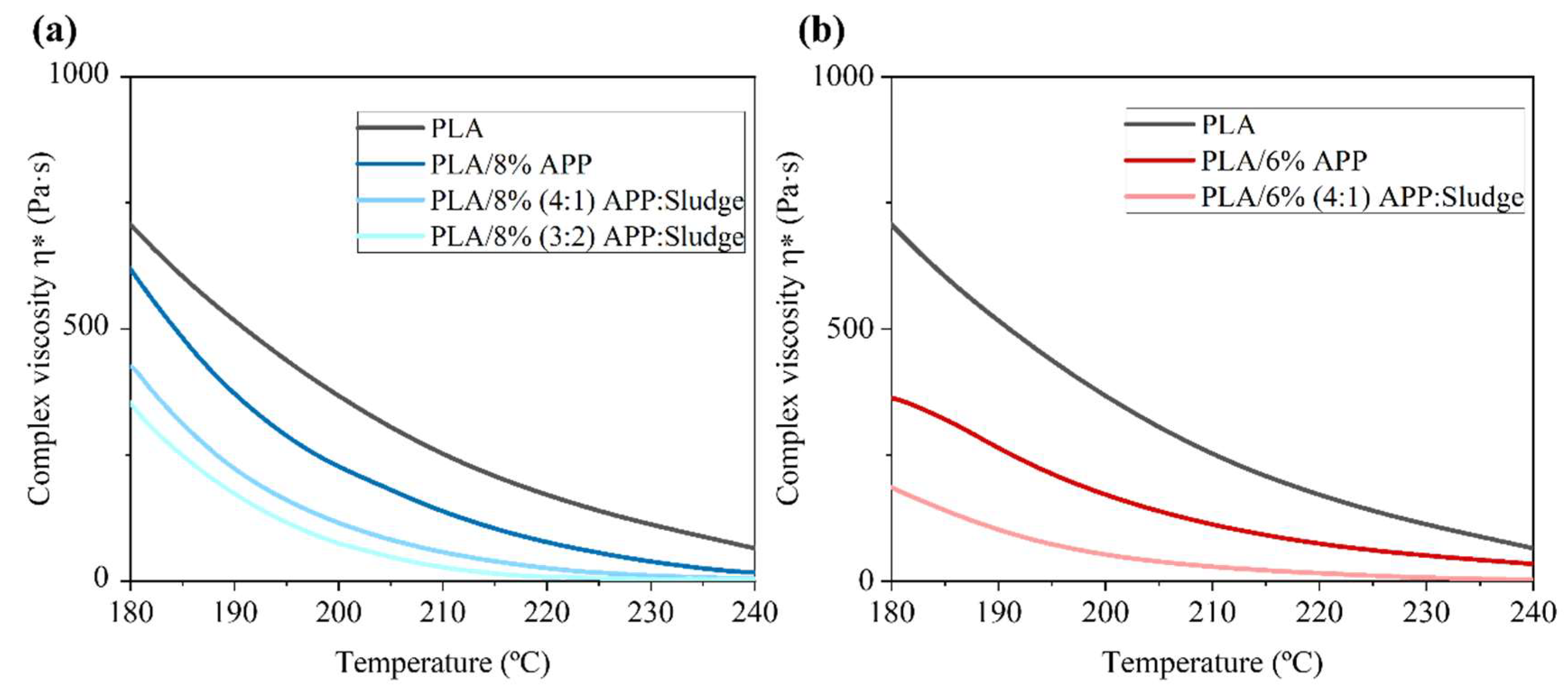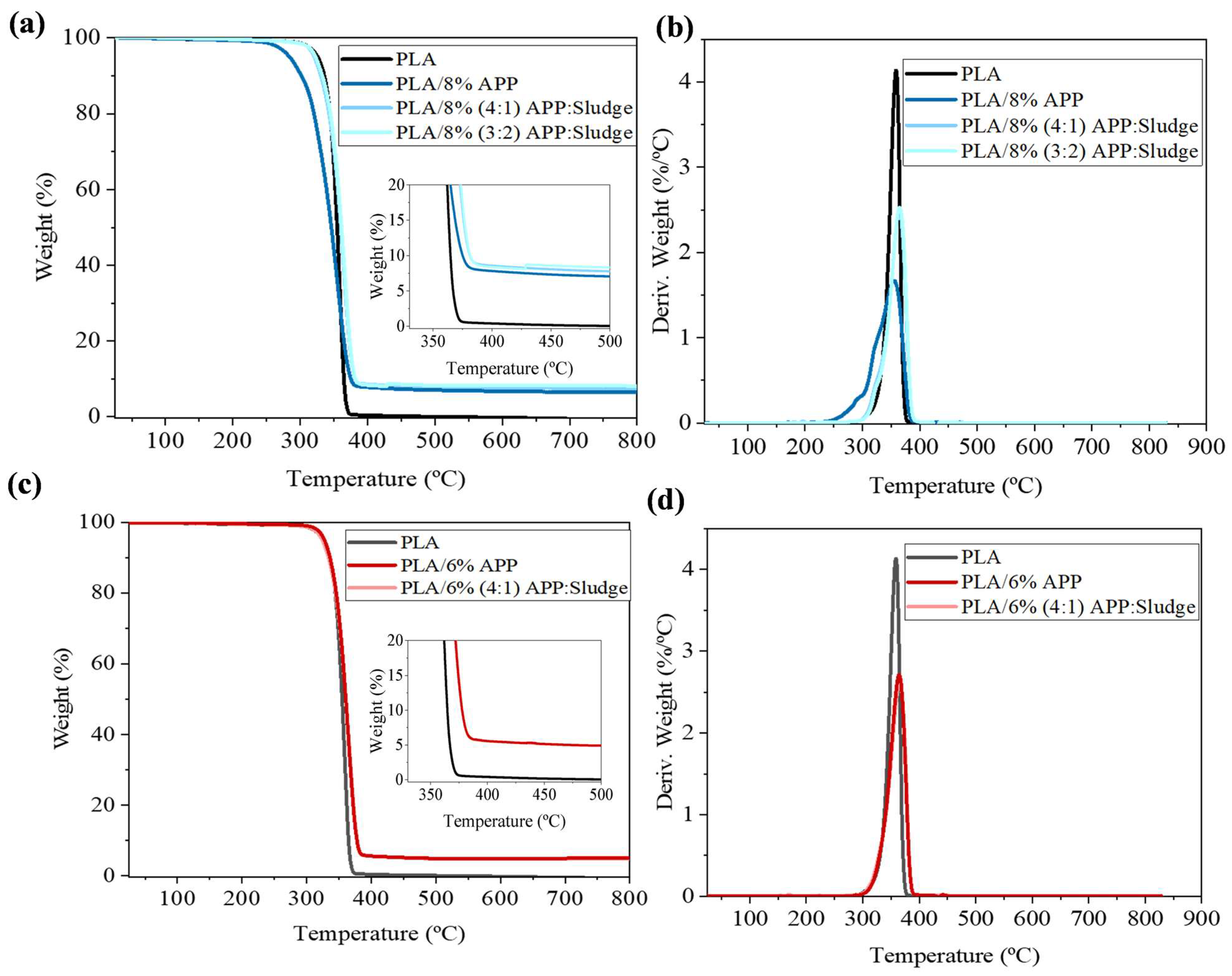 PLA/6% (4:1) APP:Sludge | 34 ± 2 | 363 ± 6 | 83 ± 1 | 1.60 ± 0.5 | 251 ± 7 | 2.0 ± 0.5 |