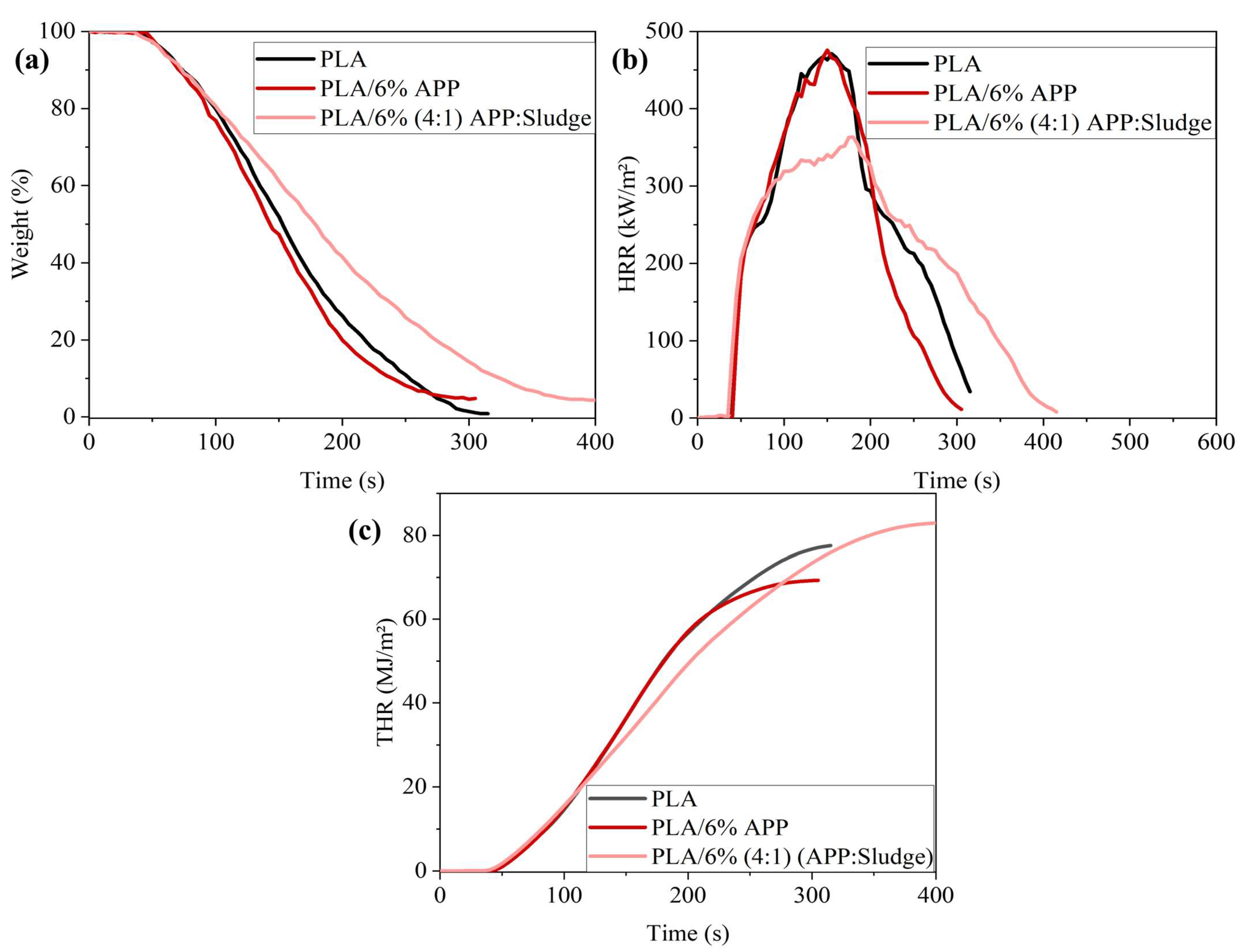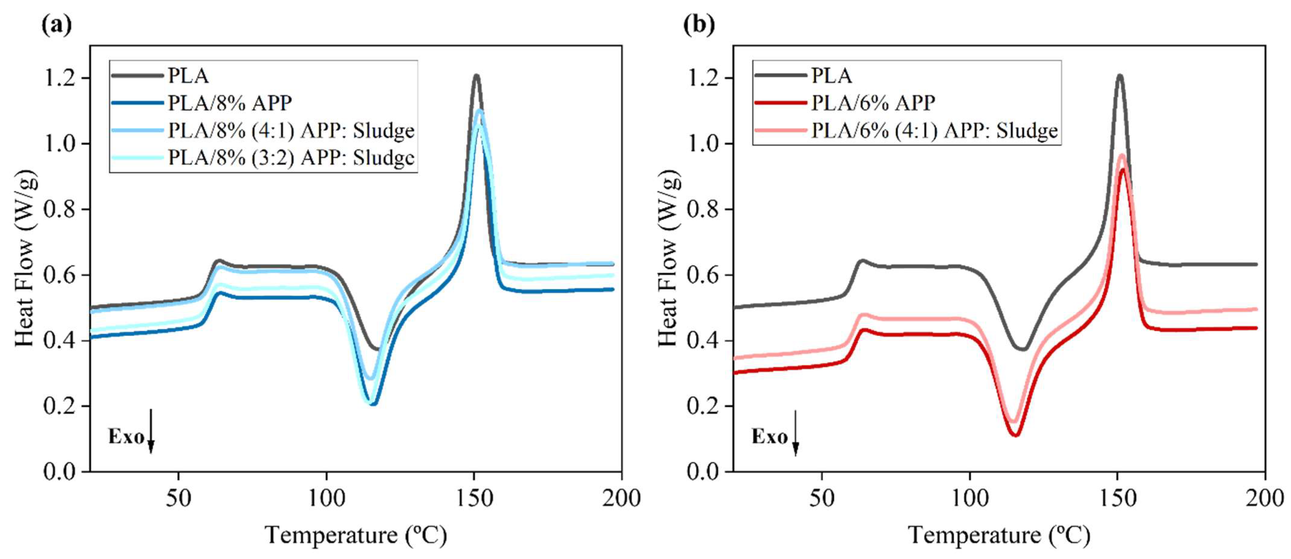 PLA/8% (3:2) APP:Sludge | 63.2 | 114.6 | 151.4 | 1.6 | 1.9 |