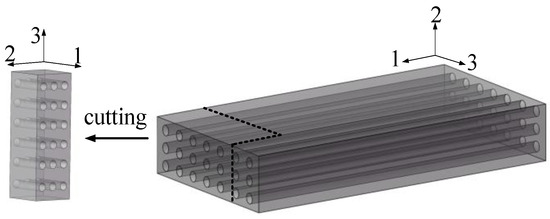 The experimental UD-CFRP composites (The materials were sourced from Zhongfu Carbon Core Cable Technology Co., Ltd. (Lianyungang, China)) were manufactured through a pultrusion process with cross-sectional dimensions of 16 mm × 60 mm and a fiber volume fraction of 72%. As detailed in Table 1, the constituent materials (carbon fibers and epoxy resin) possess distinct mechanical properties. Specimens were precision-machined (The precision machining equipment (Model: JK-DK40) was sourced from Changzhou Jinghua Numerical Control Equipment Co., Ltd., Changzhou, China) from CFRP profiles (Figure 1) to dimensions of 16 mm (1st fiber direction), 16 mm (2nd in-plane transverse direction), and 40 mm (3rd through-thickness direction) [27], aligning with principal material axes for third-direction (through-thickness) sustained loading. Specimen preparation involved diamond-tool sectioning using milling equipment under controlled feed rates (<0.1 mm/s) to minimize machining-induced defects. Post-mortem SEM characterization revealed preserved fiber continuity within gauge regions, validating specimen integrity. The inter-specimen consistency in relaxation rate evolution further confirms the reliability of the fabrication protocol.