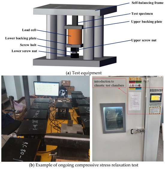 To ensure testing accuracy [28], the frame, backing plates, and screw bolts were designed with high stiffness to minimize system deformation, thereby maintaining fixed compressive strain in the specimens. Testing was conducted in a temperature-controlled furnace following this procedure: (1) stabilize the furnace (The climatic test chamber was sourced from Nanjing Test Test Equipment Co., Ltd. (Nanjing, China), with the model number GDS-015) at the target temperature; (2) apply predefined transverse compressive stress using the apparatus; and (3) place the apparatus into the furnace and monitor stress relaxation over 1000 h under constant thermal conditions.