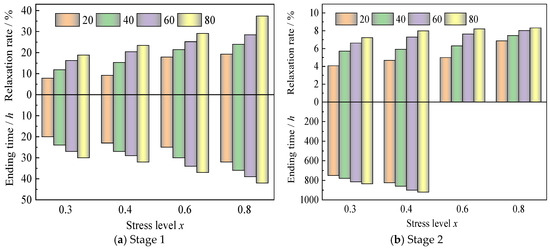 The ending time and relaxation rate under different stages, stress levels, and temperatures.