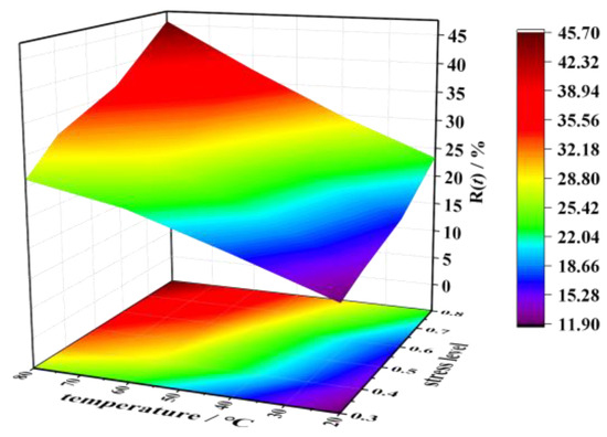 The integration of constitutive formulations (Equations (6)–(8)) enables the systematic characterization of stress relaxation rate R(t) evolution under coupled thermo-mechanical conditions. Through the unified formulation expressed in Equation (9), the temporal development of relaxation behavior becomes quantitatively predictable across arbitrary combinations of compressive stress levels (x) and normalized temperatures (ω).