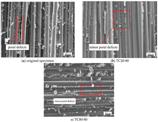 The fracture surface morphology In Figure 7a–c provides microscopic validation of these mechanisms. Comparative SEM observations (The scanning electron microscopy (SEM) observations were conducted using a JEOL JCM-7000 benchtop microscope (JEOL Ltd., Tokyo, Japan).) reveal distinct microstructural evolution: original specimens (Figure 7a) display clear resin matrix porosity, while post-relaxation counterparts (Figure 7b: 20 °C/80% stress level; Figure 7c: 80 °C/80% stress level) exhibit significantly reduced pore visibility, confirming stress- and temperature-enhanced compaction. Notably, tomentum-like failure patterns in post-relaxation specimens (Figure 7b,c) suggest intensified resin matrix deformation from creep processes and poral defect closure. Crucially, consistent fiber–resin interfacial morphology across all specimens (Figure 7a–c) corroborates preserved interfacial integrity, aligning with the observed stability in post-relaxation compressive strength.