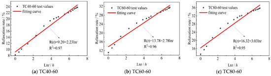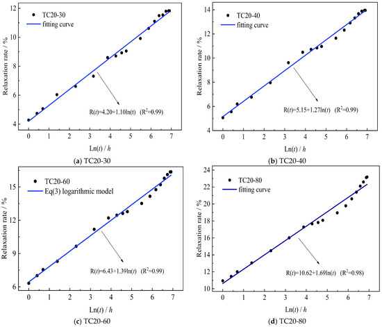 Experimental results demonstrate significant temperature-, stress level-, and time-dependent characteristics in stress relaxation development. In accordance with the JSCE-534 specification recommendation [29], the relaxation behavior can be effectively modeled using the logarithmic formulation presented in Equation (1).
